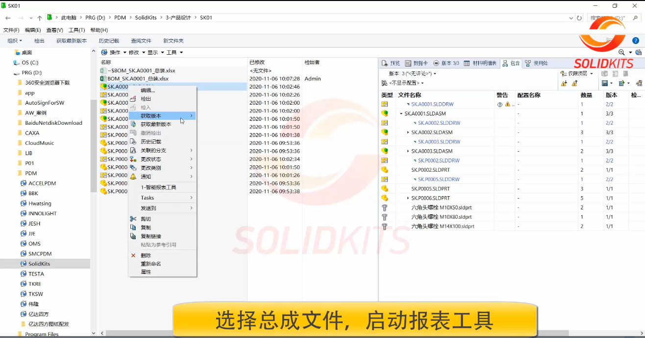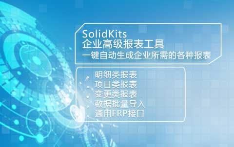 SolidKits.Reports 企業高級報表工具是一款無縫集成于SOLIDWORKS PDM的智能報表自動生成工具,可以一鍵自動生成企業所需的各種報表。如結構BOM,匯總BOM,工程圖BOM,采購BOM,項目類報表,支持數據導入,自動批量編碼,各品牌ERP集成接口。
